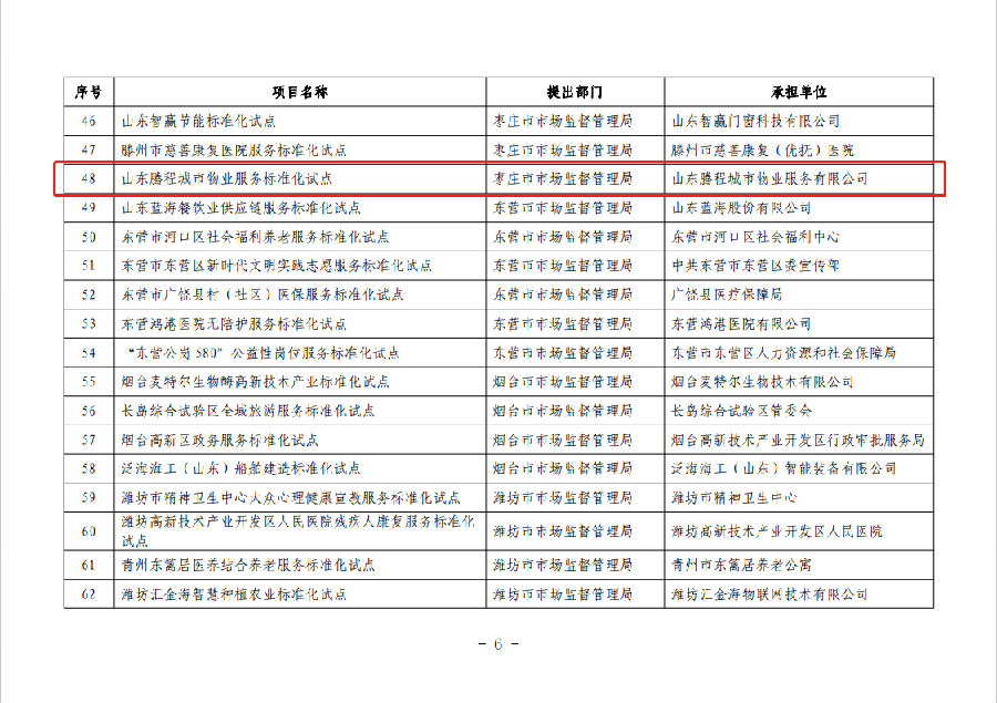 12月11日,腾程物业公司顺利通过山东省市场监督管理局标准化项目验收,成为山东省物业服务标准化试点单位 。