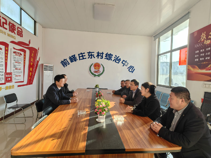 在大坞镇前峄庄东村,大坞镇党委副书记张鑫,党委委员吕文杰陪同调研,傅龙一行与村镇干部亲切座谈,在沟通中对本村的基本情况、基层党组织建设情况、村级经济发展情况有了细致的了解,并就下一步工作开展进行深入探讨。