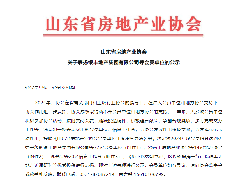 近日,山东省房地产业协会发布了关于表扬优秀会员单位的公示,山东betway88西汉姆联发展有限公司荣获“山东省房地产业协会2024年度优秀会员单位”荣誉称号。