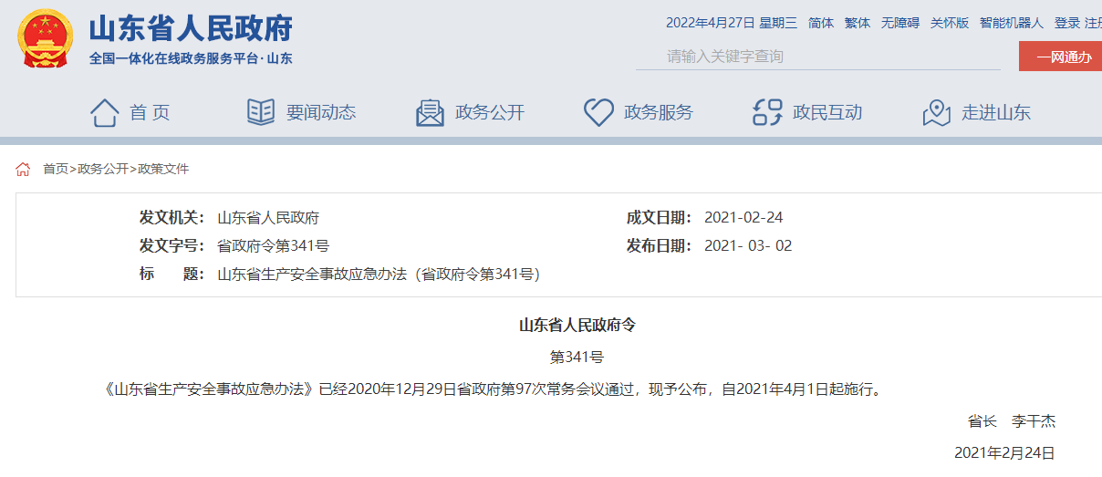 《山东省生产安全事故应急办法》已经2020年12月29日省政府第97次常务会议通过,现予公布,自2021年4月1日起施行。