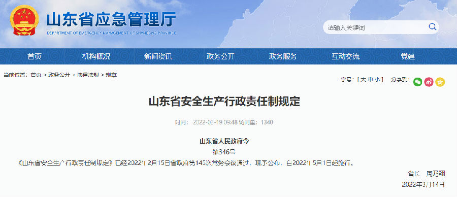 《山东省安全生产行政责任制规定》已经2022年2月15日省政府第145次常务会议通过,现予公布,自2022年5月1日起施行。