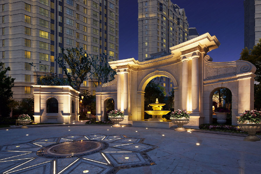 立面特点三段式的处理,营造稳重庄严的气势。整体采用米黄色石材,提升建筑品质感,立面上体现经典的法式元素,如柱式、拱券、老虎窗等,同时穿插玻璃材质,充分体现小区整体品质。